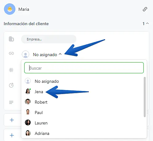 Para selecionar otro agente, solo vaya a la parte superior derecha y haga clic. Verá una lista de los agentes disponibles en su equipo para seleccionarlo. Para hacerlo más fácil, podrá buscar por nombre, correo, teléfono o cargo. También podrá dejarlo sin un agente asignado al seleccionar: "No asignado"