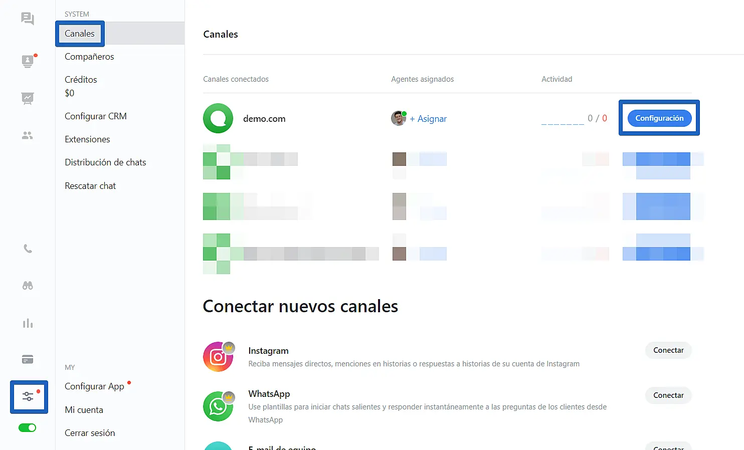 Pare personalizar los textos predeterminados del widget de JivoChat en su sitio web, abra su aplicación web o cualquiera de nuestras aplicaciones de escritorio y vaya a: "Ajustes"-> "Canales"-> "Configuraciones"(debajo del nombre del canal).