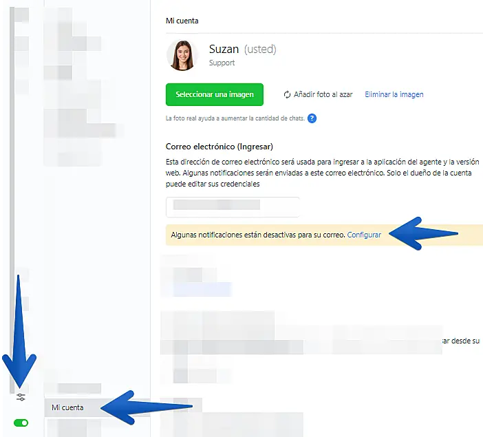 Primero, inicie sesión en su aplicación JivoChat Desktop o aplicación web y vaya a "Ajustes" > "Mi Cuenta" -> En "Correo electrónico", clic en "Configurar"