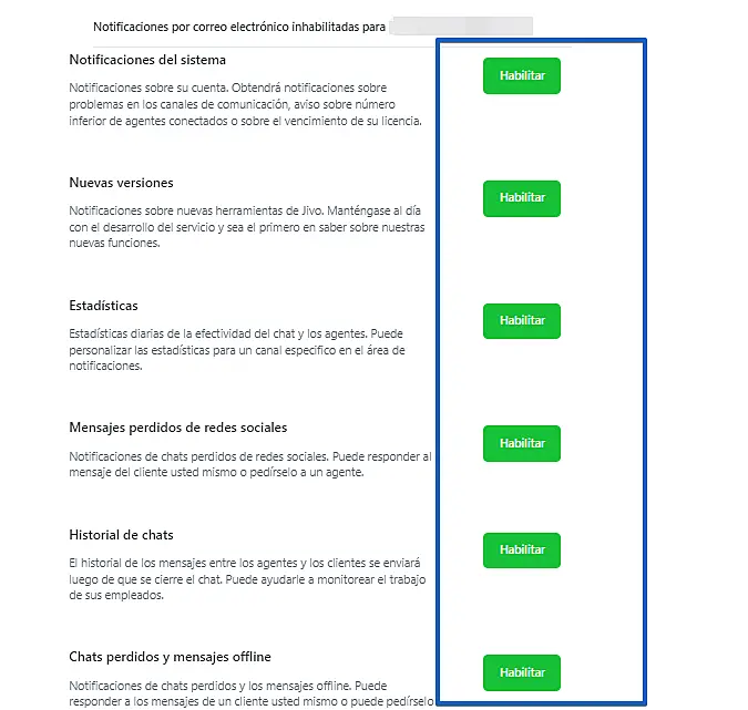 Luego haga clic en el botón "Habilitar" en todas las opciones, para que su correo electrónico se elimine de la cancelación de suscripción (lista de cancelación de suscripción) y es posible que vuelva a recibir correos electrónicos de notificación de JivoChat