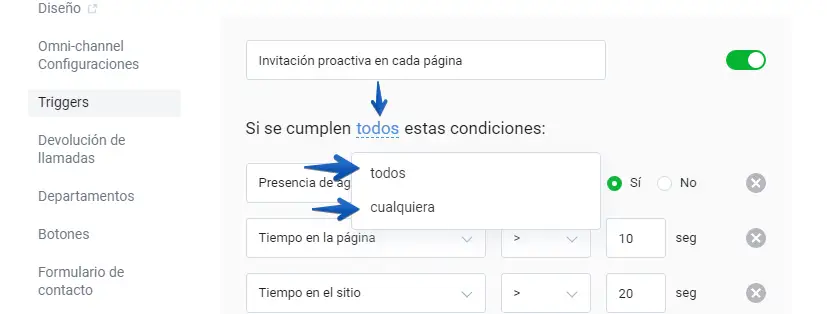 Tiempo desde la última invitación proactiva: esta condición te ayuda a proteger a tus visitantes de recibir triggers ilimitados. Si el visitante ignora el widget de chat y va a otra página, el siguiente trigger funcionará después de que expire el "Tiempo desde la última invitación proactiva".