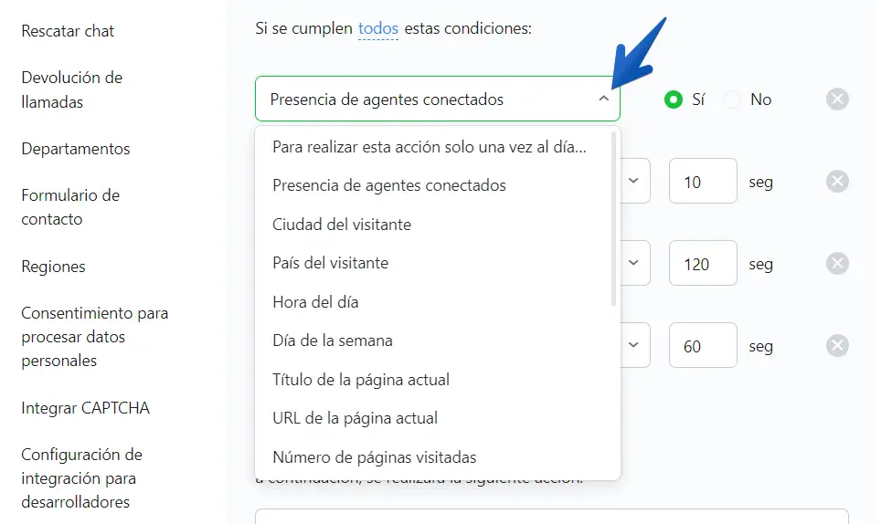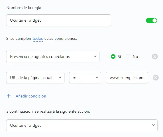 Presencia de agentes conectados: esto ayuda al sistema a entender qué tipo de widget de chat se debe usar. Si eliges "NO", funcionará para el formulario fuera de línea, y si eliges "Sí", funcionará para el formulario en línea. Esta condición es necesaria para cada trigger, excepto para la acción "Ocultar el widget".