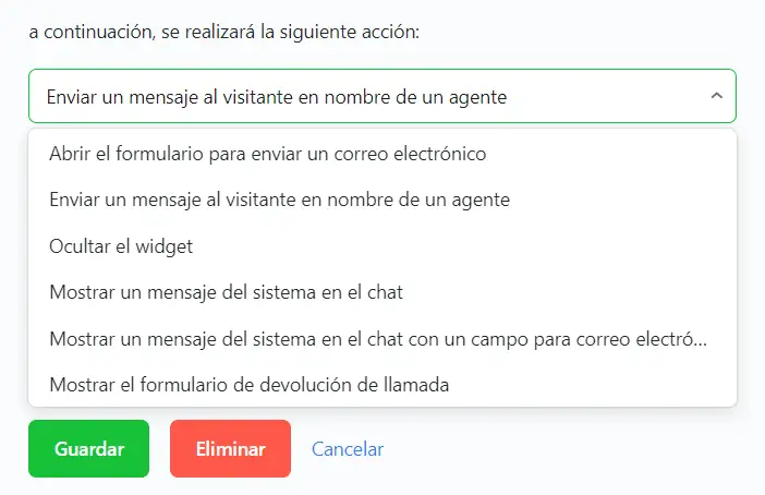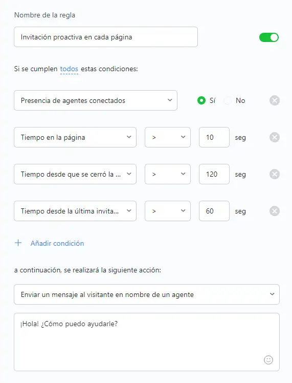Enviar un mensaje al visitante en nombre de un agente: Envía automáticamente una invitación para chatear en nombre del agente. Condición: "La presencia de agentes en línea debe ser "Si"