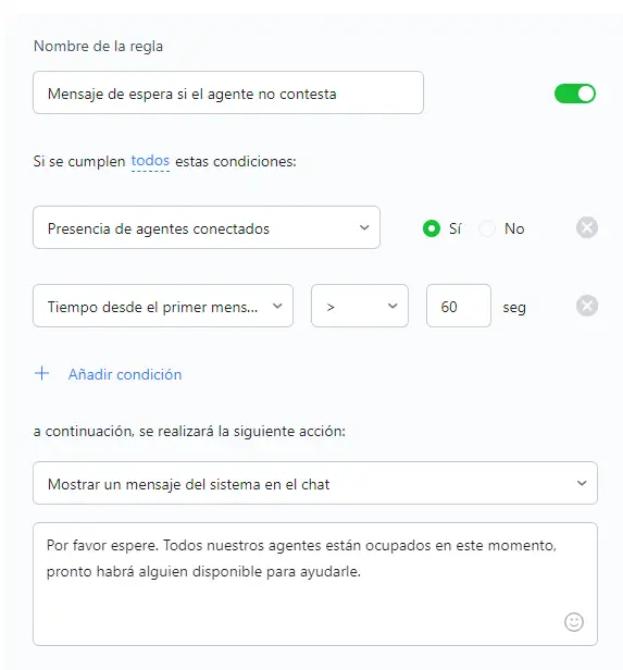 Mostrar un mensaje del sistema en el chat: Si el cliente envía un mensaje en el chat, y el agente no responde por un tiempo determinado,este trigger mostrará un mensaje especial al cliente. Condición: "La presencia de agentes en línea debe ser "Si"