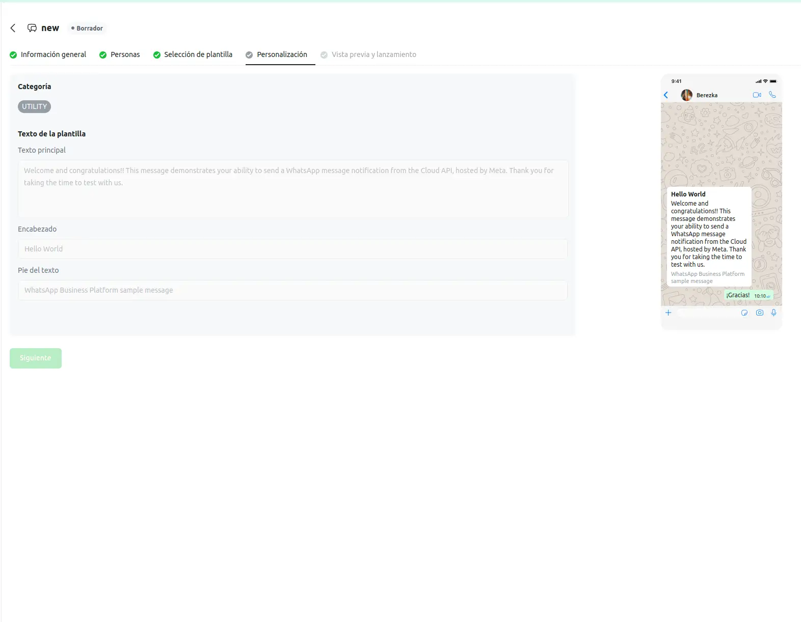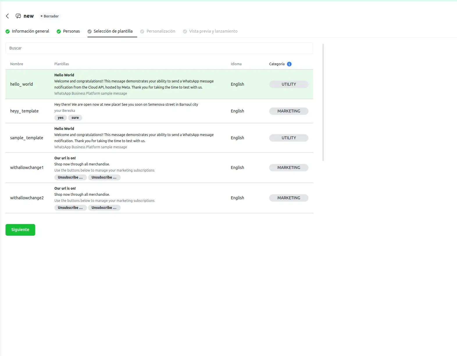 Tenga en cuenta que solo puede seleccionar una plantilla sin variables (hasta la próxima actualización) y solo en un idioma. Si desea enviar una plantilla a una audiencia multilingüe, realice varias campañas.