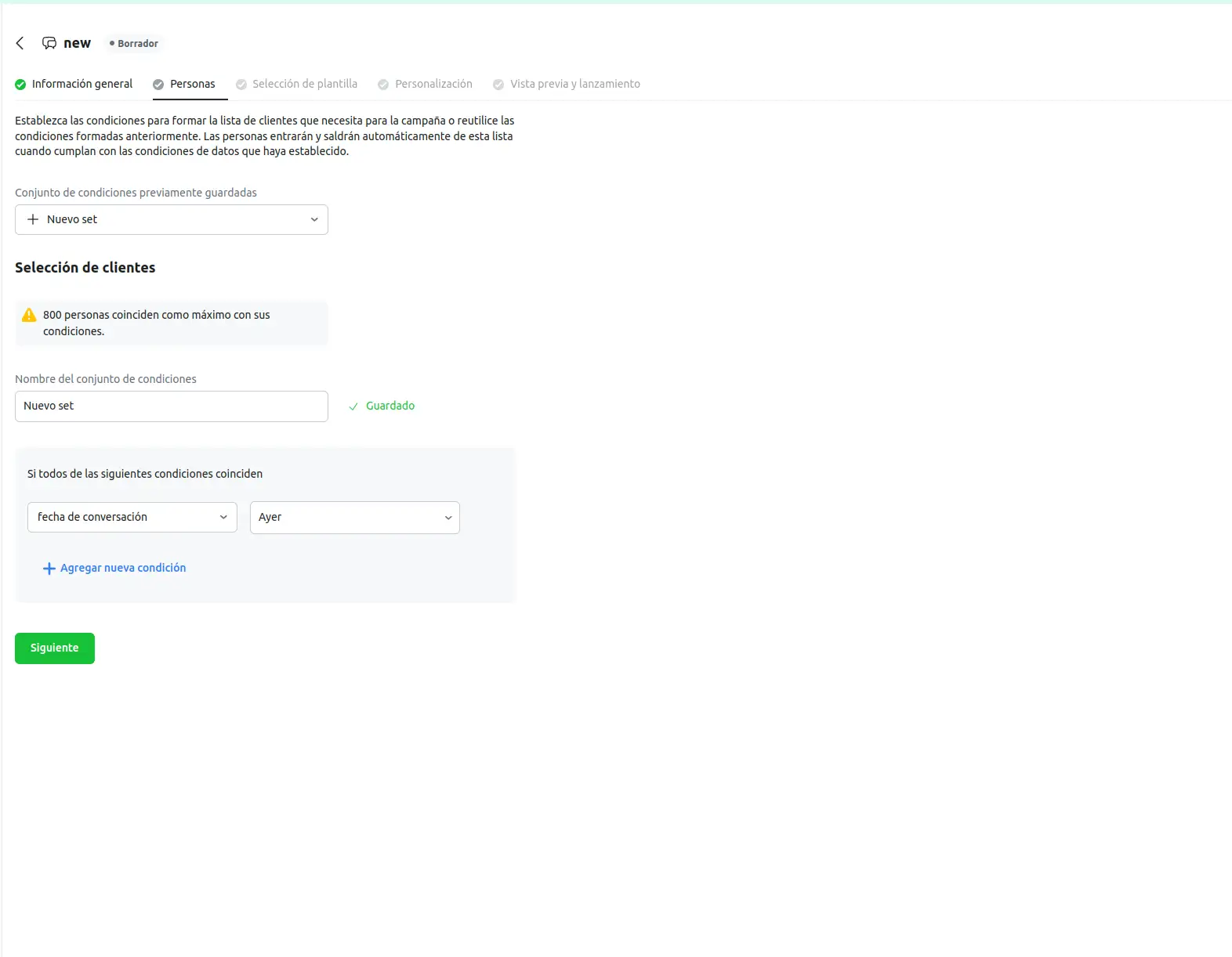 - Elige las condiciones para los clientes para los que necesitas la campaña.