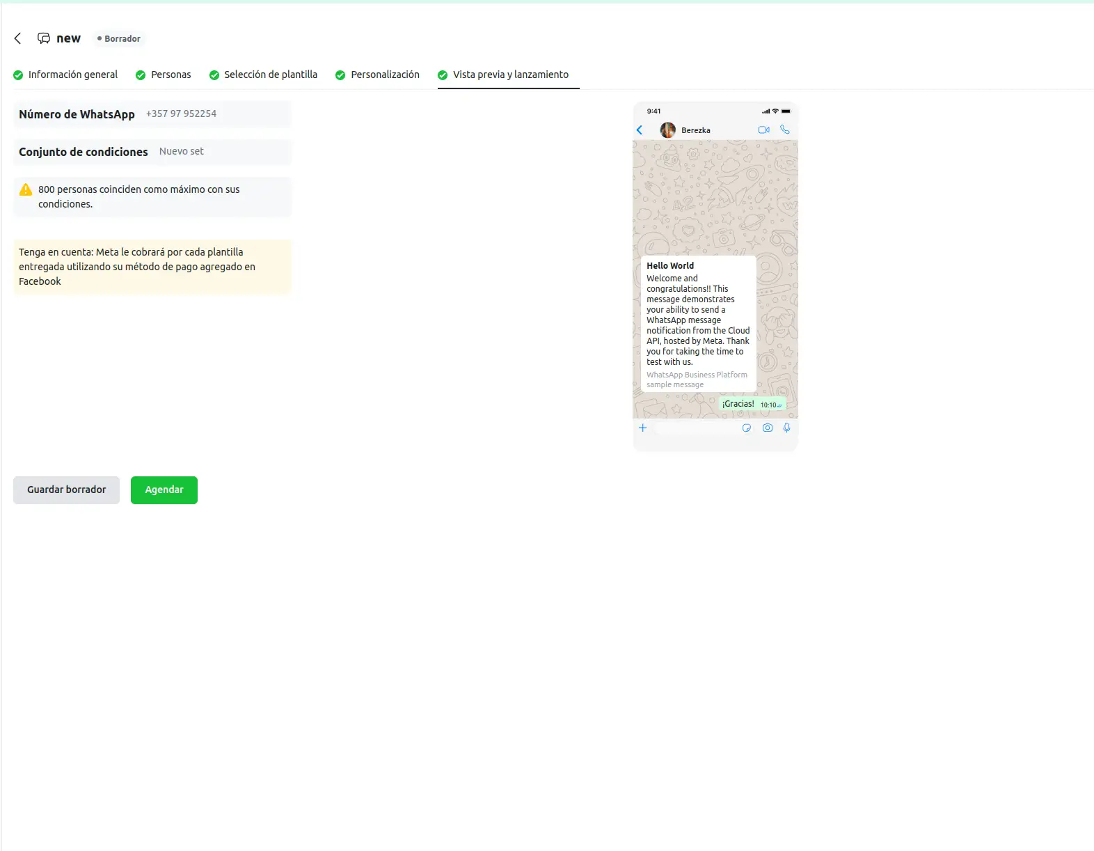 Verifique también nuevamente el número máximo de destinatarios. Es posible que la plantilla no llegue a todos los clientes, pero se pagará cada mensaje entregado